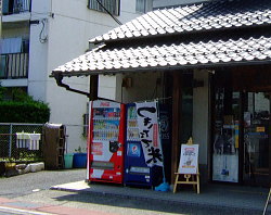 すだれで隠されていますが青い自動販売機が目印で判別しています。