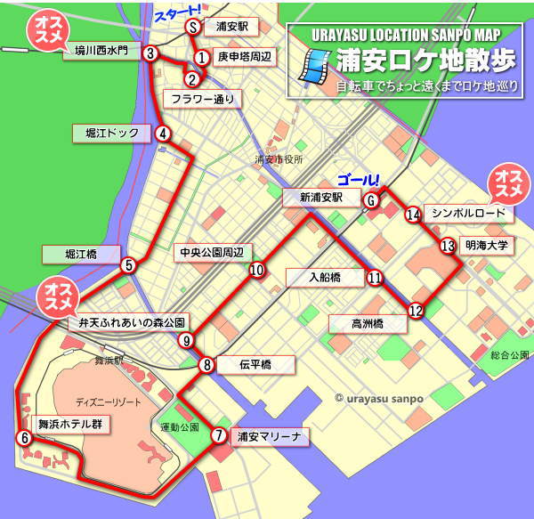 浦安全域にロケ地は広がっています。広範囲への移動は自転車が一番ということで、自転車用のツーリストロケ地マップを作成しました。事故などの無いよう気を付けて行ってらっしゃい。