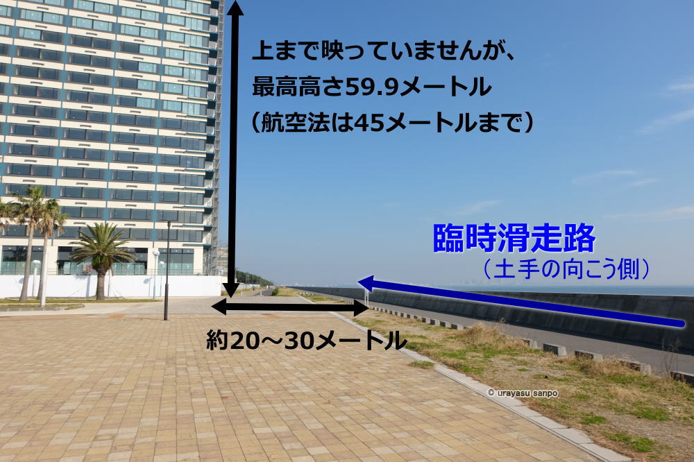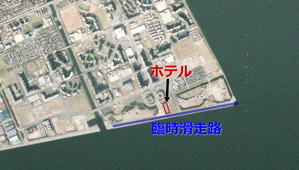 航空法の中に空港周辺における建物等設置の制限というものがあります。空港周辺に一定の高さ(45メートル)の建物が建てられないというもので、臨時滑走路そばにオープンしたホテル(最高高さ59.9メートル)が航空法の対象になってしまう恐れがあります。