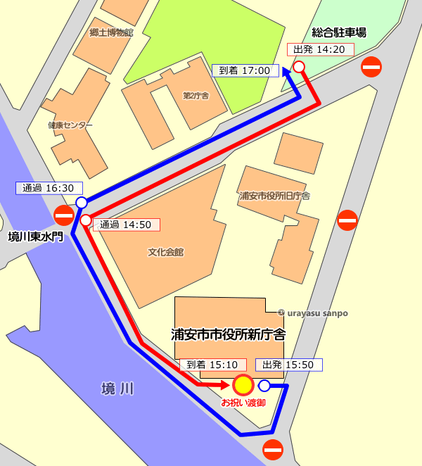 | 午後3時10分 | 新庁舎正門玄関 到着 (浦安市新庁舎エントランスホールで1基づつお祝い) |