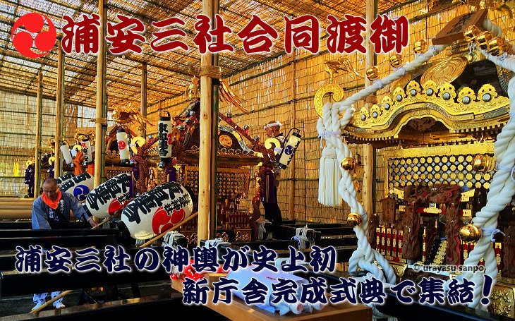 6月4日に浦安新庁舎完成式典では、豊受神社から2基、清瀧神社から2基、稲荷神社から1基と合計5基の神輿が合同で祝い渡御を行います。史上初といわれる浦安三社合同神輿渡御は、浦安三社祭本番前に見逃せないイベントになりそうです。