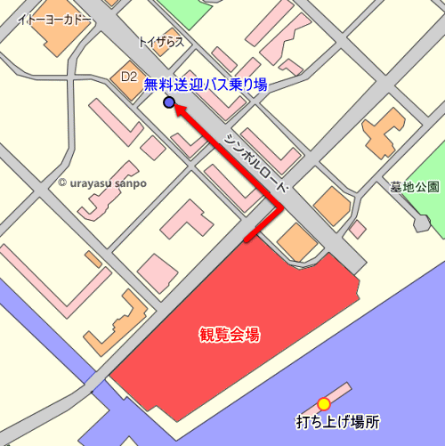 去年から無料送迎バス乗り場が変更になります。シンボルロード側になるので、下の地図を確認して、帰りの際は注意してください。