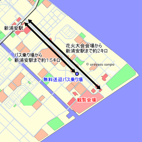 無料送迎バスは最も利用する人が多い帰宅方法で、一番激混みになります。運行時間は午後8時30分から午後10時頃までを予定しています。去年から乗り場が変更になっているので地図で必ず確認にしてください。(新浦安駅行き、浦安駅行き共に同じ場所)