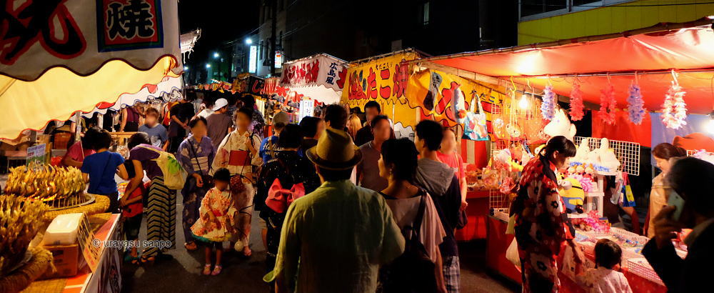 浦安駅前のスクランブル交差点から浦安中央公民館や猫実郵便局周辺まで250メートルに渡り屋台がズラッと出店されます。