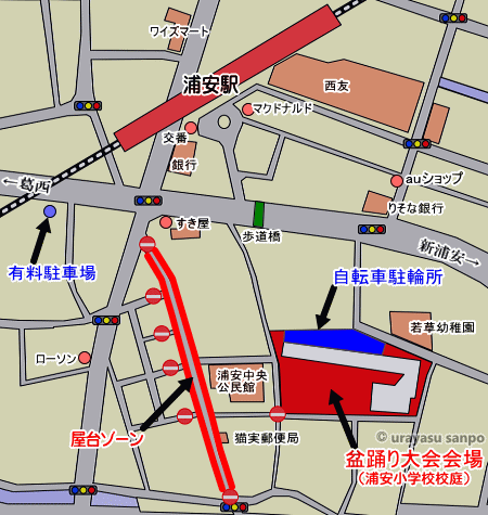 浦安盆踊り大会の詳しい地図を載せています。屋台の情報や有料駐車場の情報もこのページをご確認ください。
