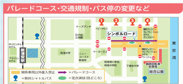 駐輪場は、総合公園周辺(東京ディズニーセレブレーションホテル:ウィッシュ側)に設置される臨時駐輪場が利用可能です。 新浦安駅周辺は専用駐輪場がないため、有料駐輪場のご利用になります。会場への直接の乗り入れは禁止されていますので注意してください。