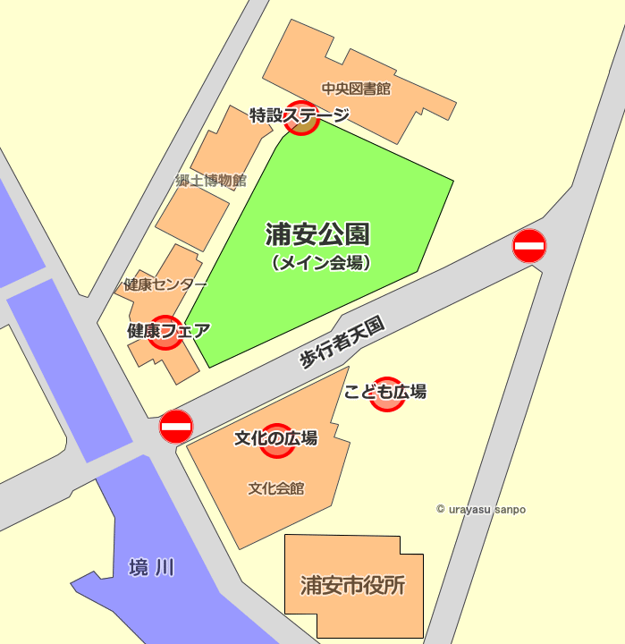 浦安公園が浦安市民まつりのメイン会場になります。郷土博物館側には特設ステージが設置され、健康センターでは健康フェア(20日のみ)、文化会館と中心とした文化の広場では映画やeスポーツ体験、立体駐車場前では「こどもがつくるまち@うらやす」などが開催されます。