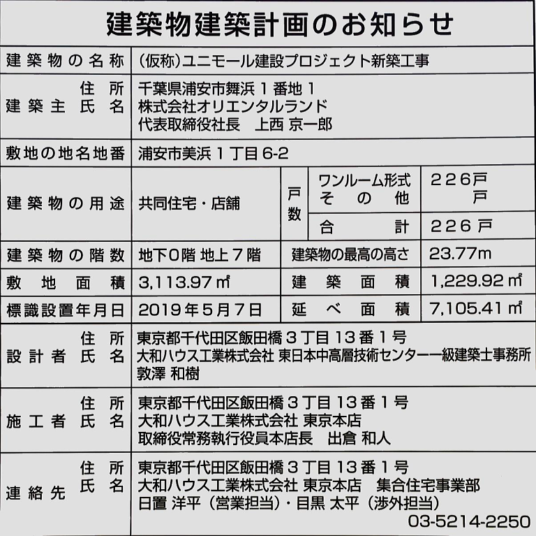 上記表の浦安市美浜1-6-2はエルシティ新浦安というマンションになります。建築計画概要はユニモール前にあるので住所が違うのは今のところ不明。敷地面積3110平方メートルは現ユニモールにほぼ一致している。
